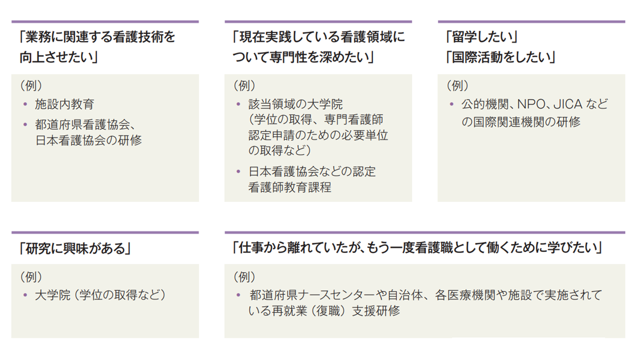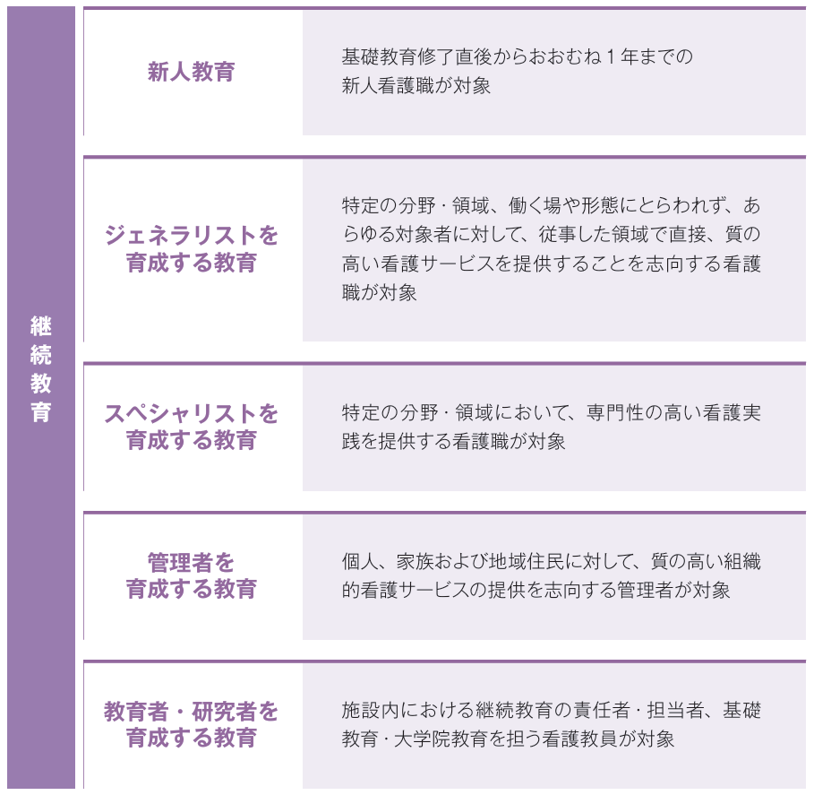 看護職は生涯を通して働き続けることができる専門職ですが、免許取得後も時代の変化に対応するために継続して学習し、能力の開発や維持をすることが求められます。そのため、継続教育として、看護基礎教育に積み上げられる様々な学習機会が提供されています。